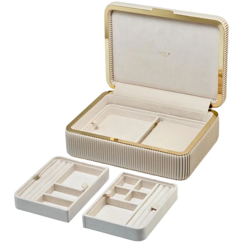- Inside are three removable LusterLoc-lined jewellery trays with 10 compartments for necklaces, rings, bracelets and earrings.