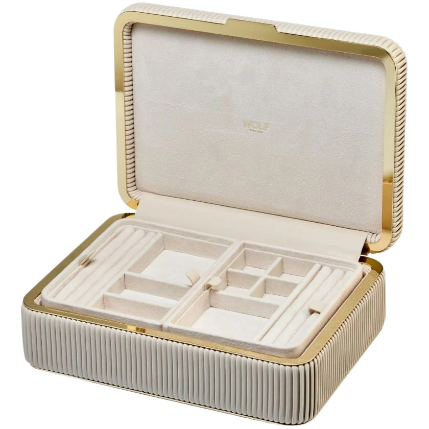 - The Bella Medium Jewellery Box brings opulence and sophistication with her smooth vegan leather lid, perfectly pleated sides and gold finish interior frame and hardware.
