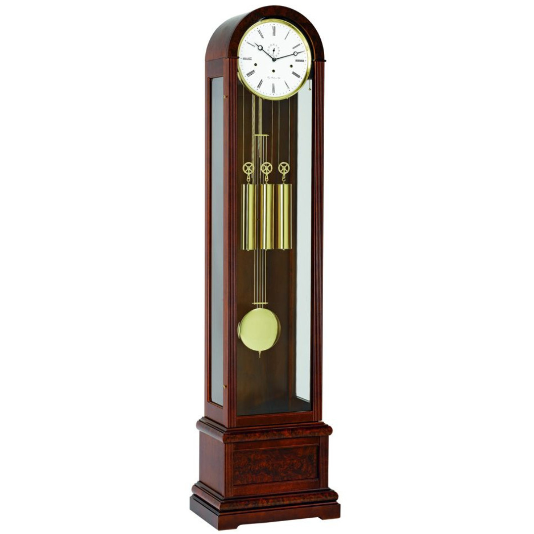 - 8-day cable-driven mechanical movement 4/4 Westminster Hermle floor clock.