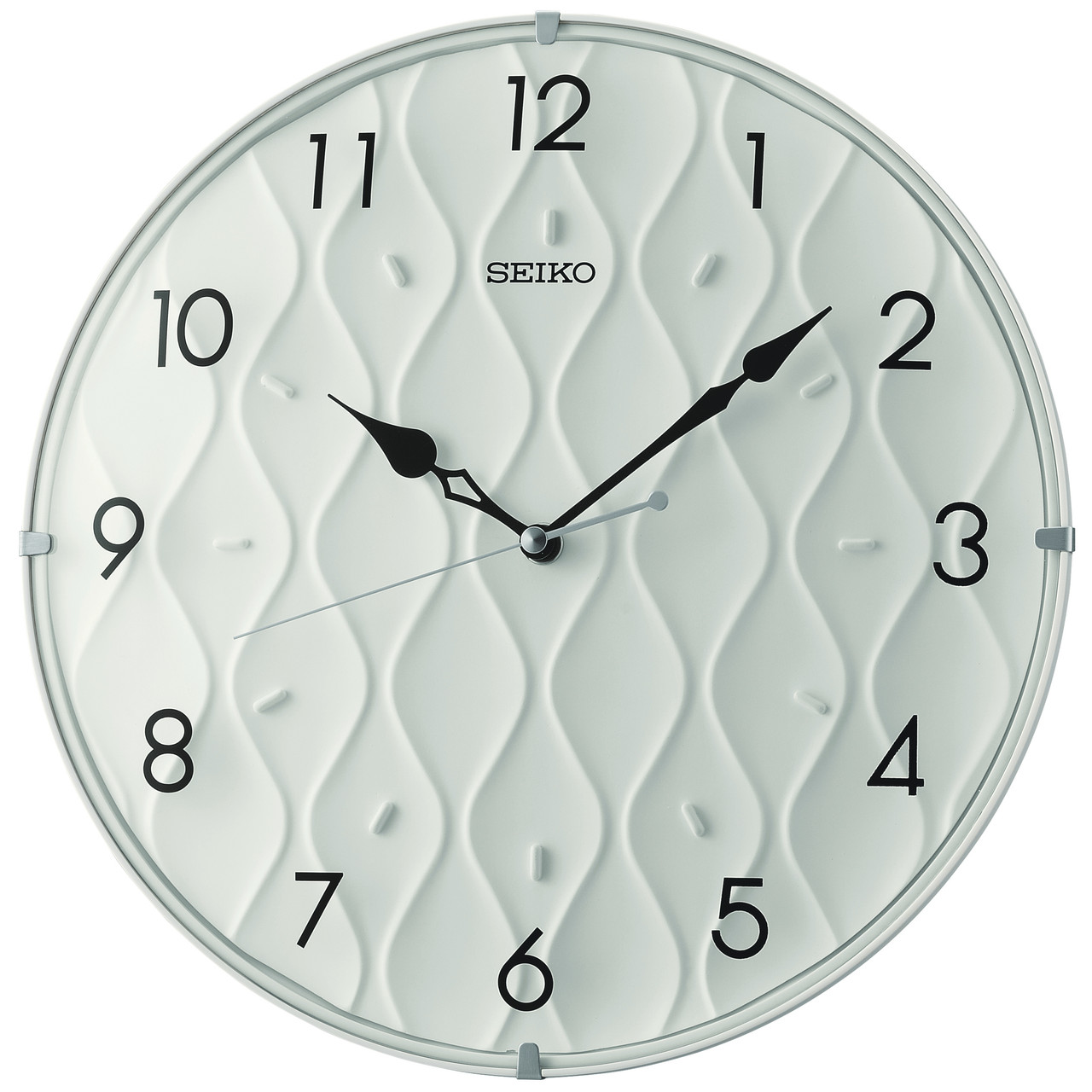 - This Seiko wall clock features a white dial with interesting wave pattern, Arabic numerals and the "Seiko" logo at the 12 o'clock position.