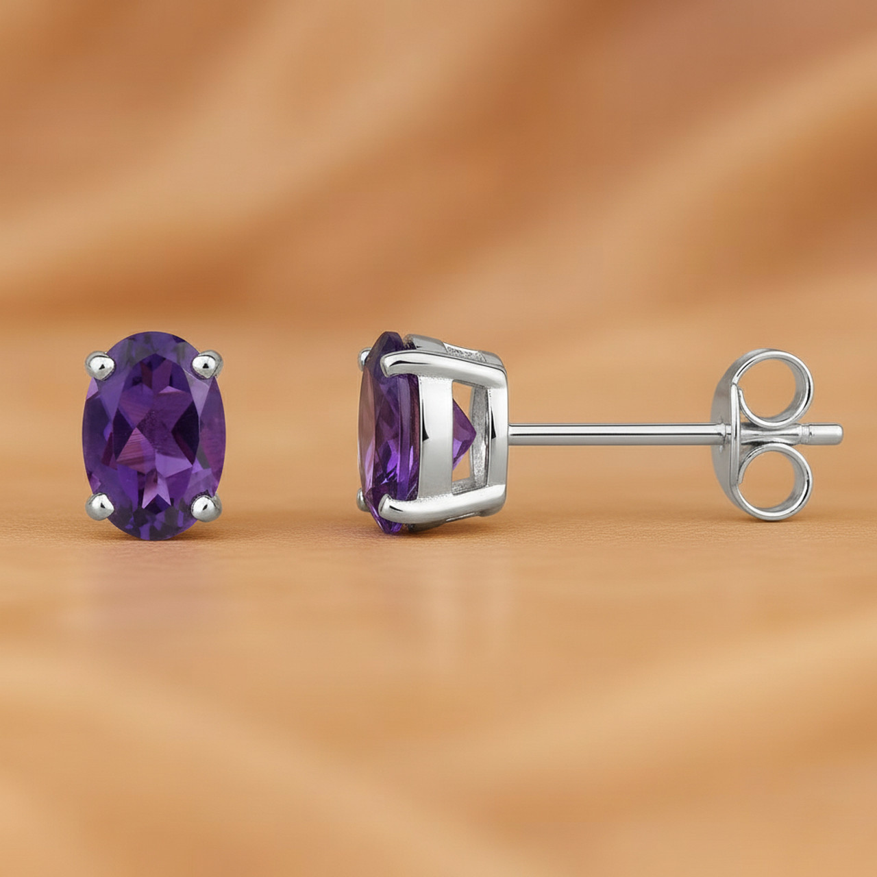 - Stunning 9 Carat White Gold Oval Amethyst Claw Stud Earrings.