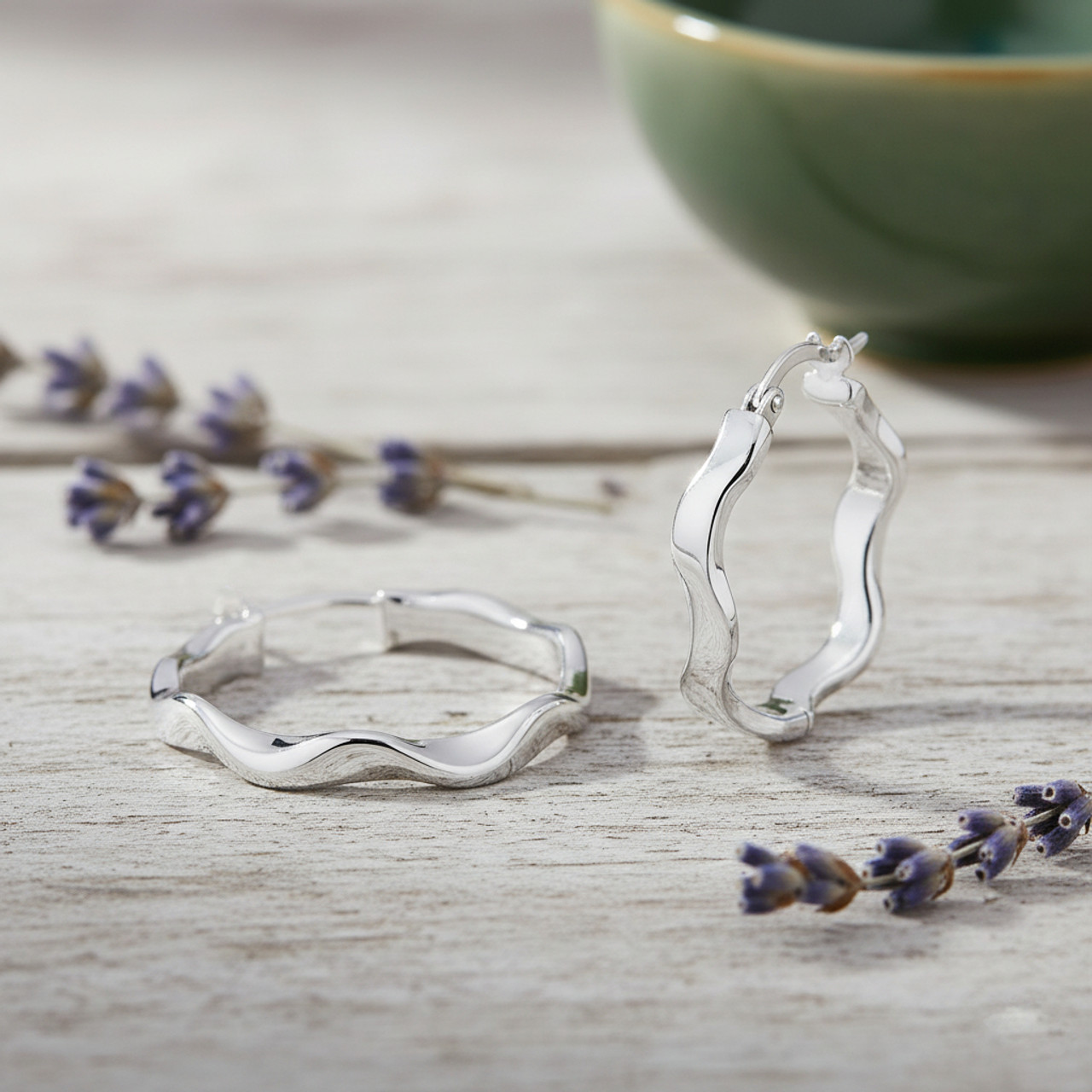 - Stunning 9 Carat White Gold Round Wavy Hoop Earrings.
