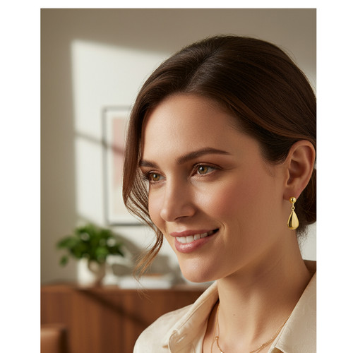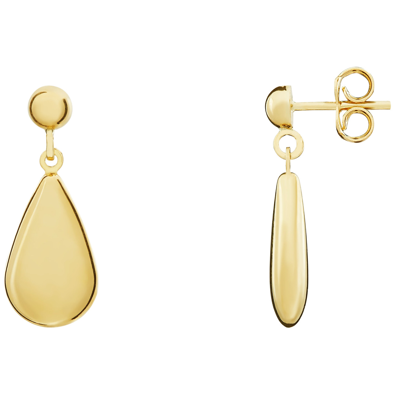 - Stunning 9 Carat Yellow Gold Flat Polished Pear Shaped Drop Earrings.