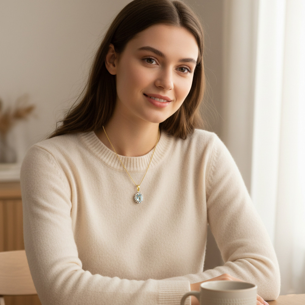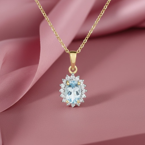 - Stunning 9 Carat Yellow Gold Oval Aquamarine & Diamond Cluster Pendant.