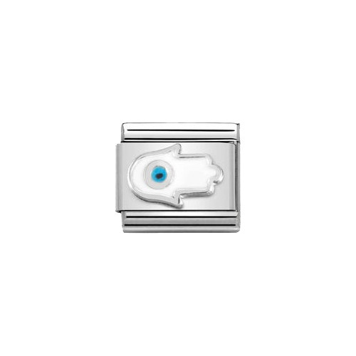 - Original Nomination link for composable classic bracelets in stainless-steel and sterling silver with coloured enamel on a fatima hand white symbol.