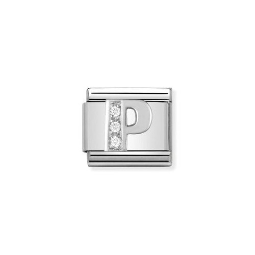 - Original alphabet charm for Nomination's composable classic bracelet with letter P in stainless-steel, sterling silver and cubic zirconia.