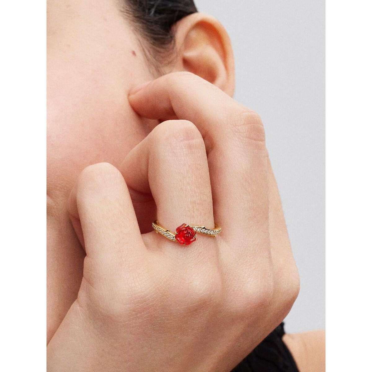 - Inspired by Disney's Beauty and The Beast, this 14K gold-plated Rose Ring features a radiant red Murano glass rose and sparkling cubic zirconia for a magical, fairy-tale touch.