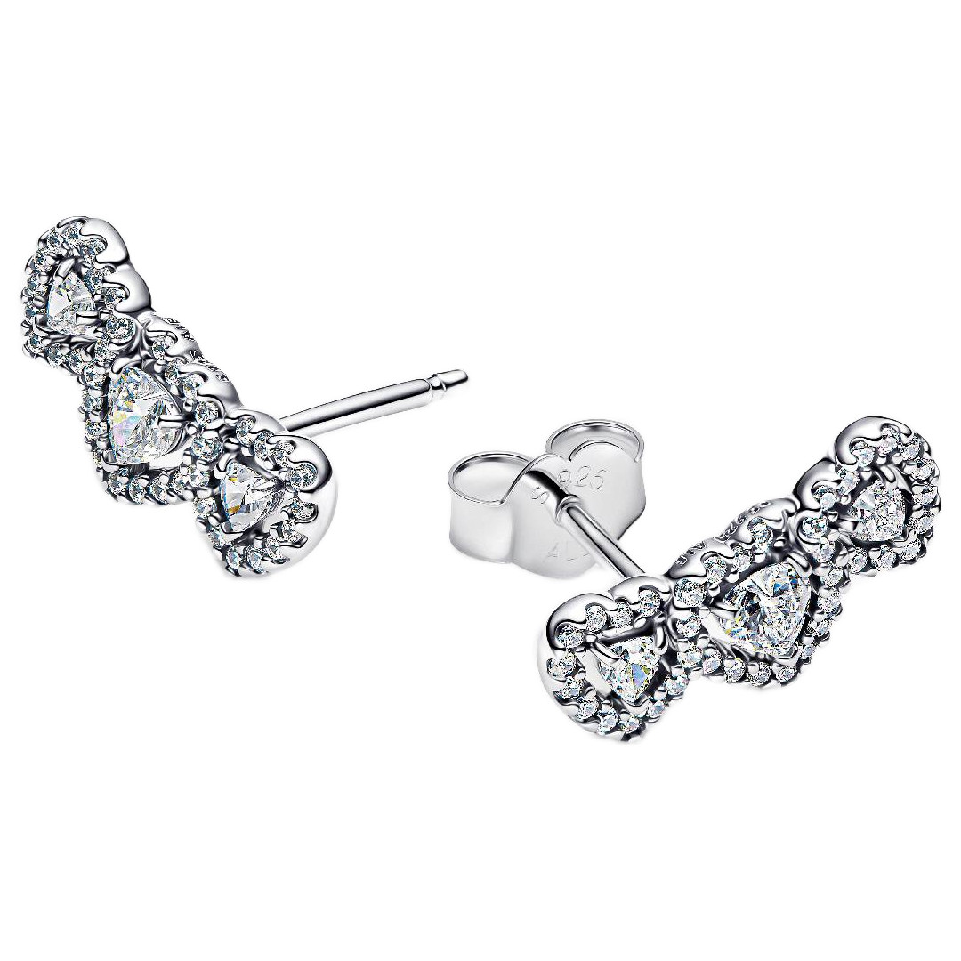 - Radiate love Sold as a pair, these sterling silver stud earrings feature three heart-shaped stones connected by a halo of sparkling pave. the perfect gift for yourself or someone special.
