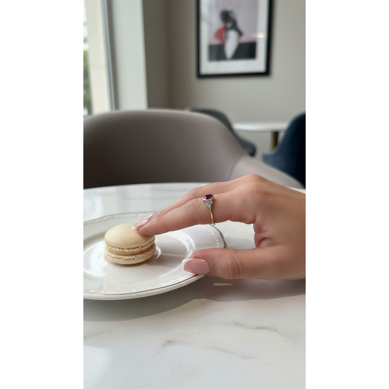 - Cluster ring with an oval ruby and natural diamonds, creating a striking and elegant statement piece