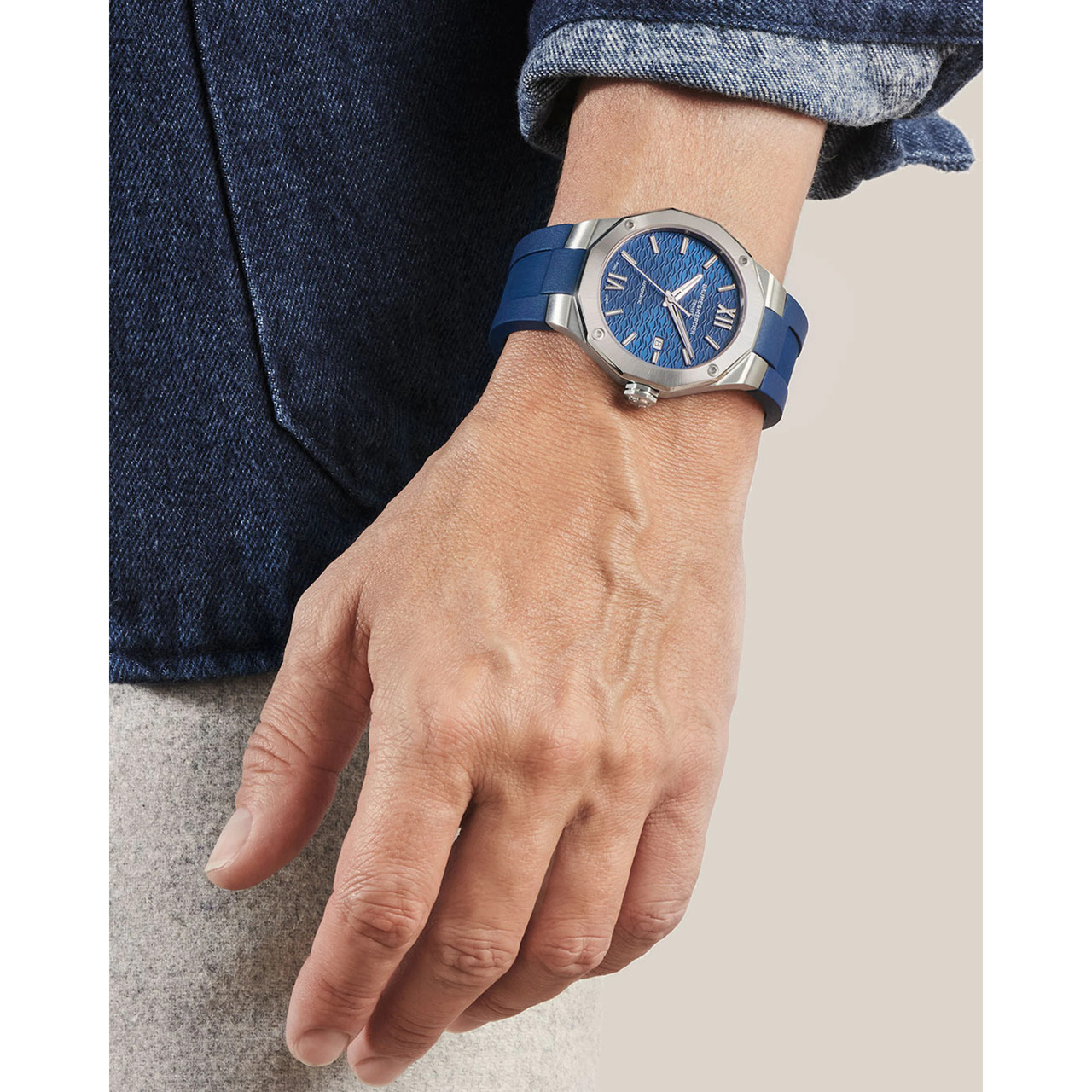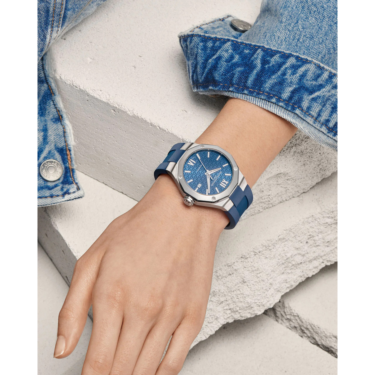 - Blue rubber strap with a satin-finished adjustable triple folding buckle clasp to ensure security on the wrist.