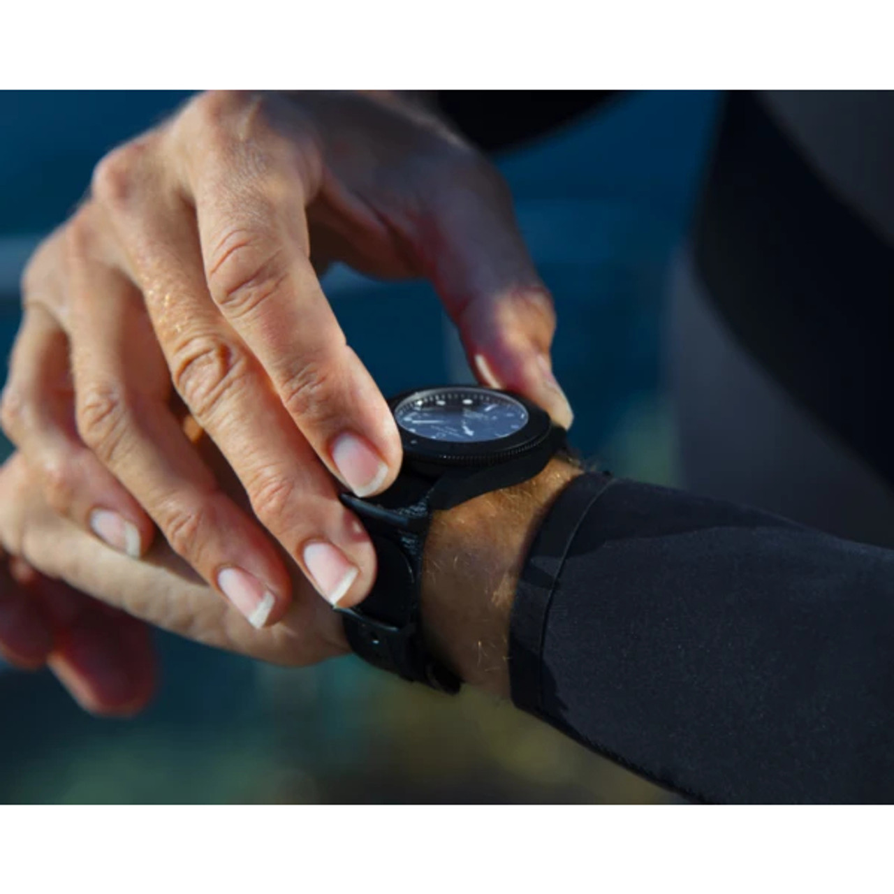 - A black synthetic strap finished with a 316L stainless-steel buckle clasp to ensure security on the wrist.