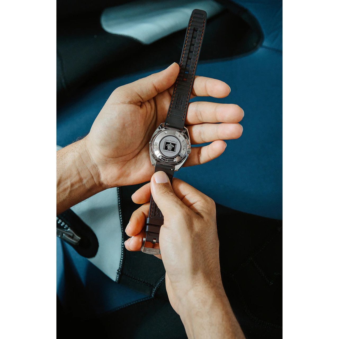 - A black quick-release rubber strap finished with a 316L stainless-steel buckle clasp to ensure security on the wrist.
