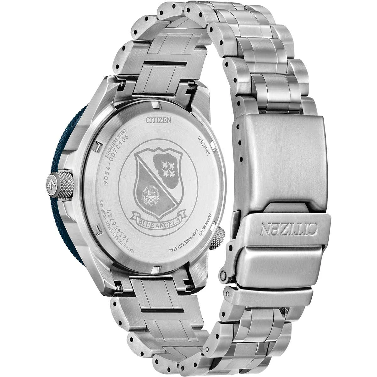 - The case features a fixed 24-hour bezel rendered in signature Blue Angels blue, complemented by a yellow slide-rule scale for instant visual impact and aviation utility.