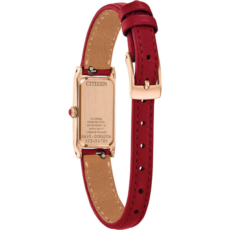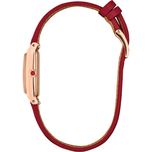 - A red leather strap finished with a buckle clasp to ensure security on the wrist.