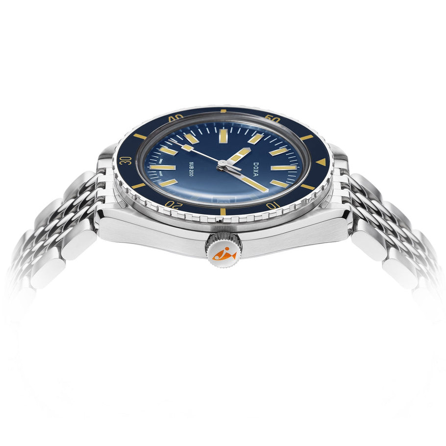 - The bracelet features the iconic DOXA fish symbol, highlighting the brand's diving heritage.