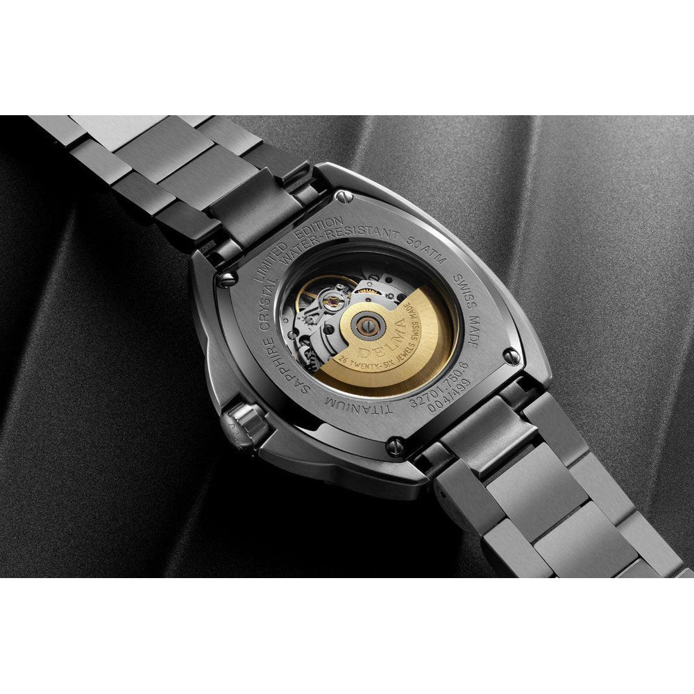 - A titanium three-link bracelet finished with a titanium deployment clasp and pushers to ensure security on the wrist.