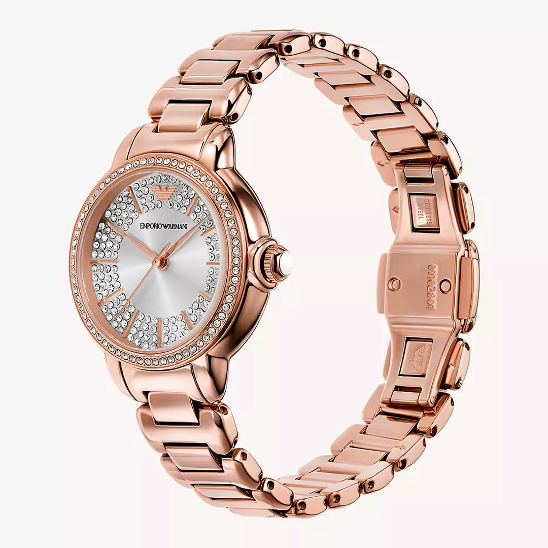 - Emporio Armani's watch showcases a silver glossy sunray dial with a stone-set face.