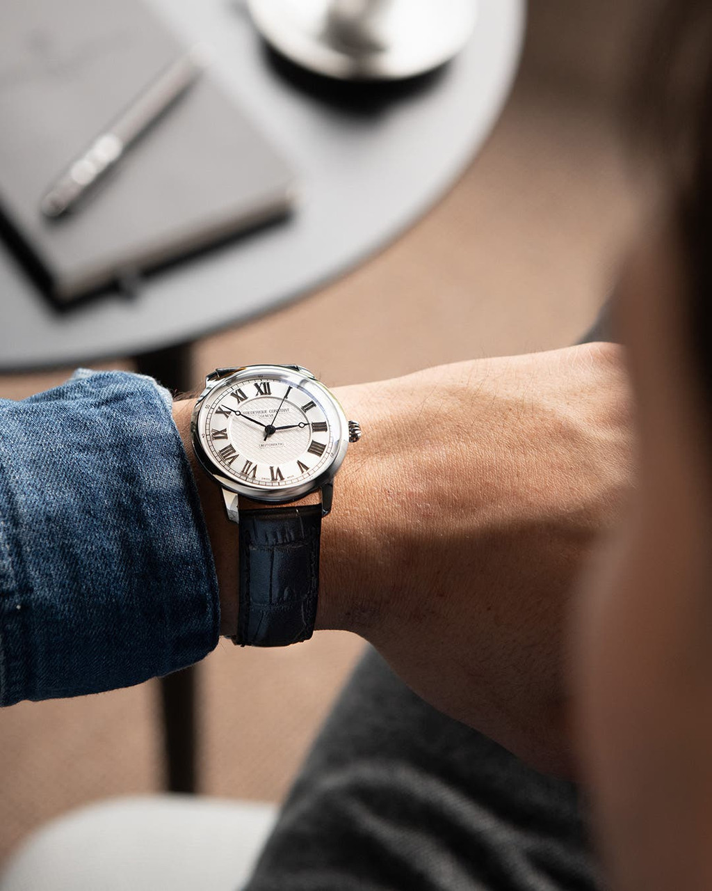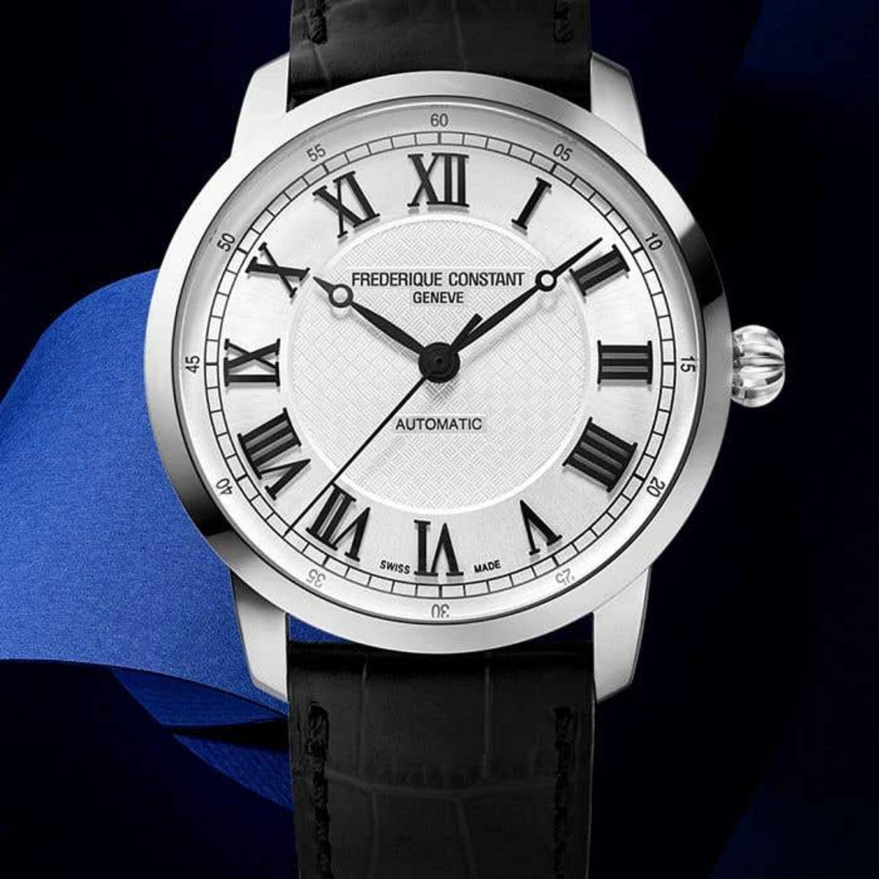 - A white mother of pearl sunray & embossed colimacon decorated dial Frederique Constant Men's watch.