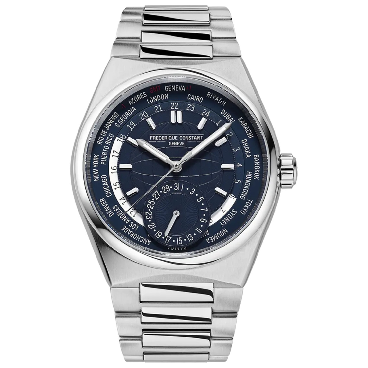 - A blue dial with globe pattern embossed in the center Frederique Constant Men's watch.