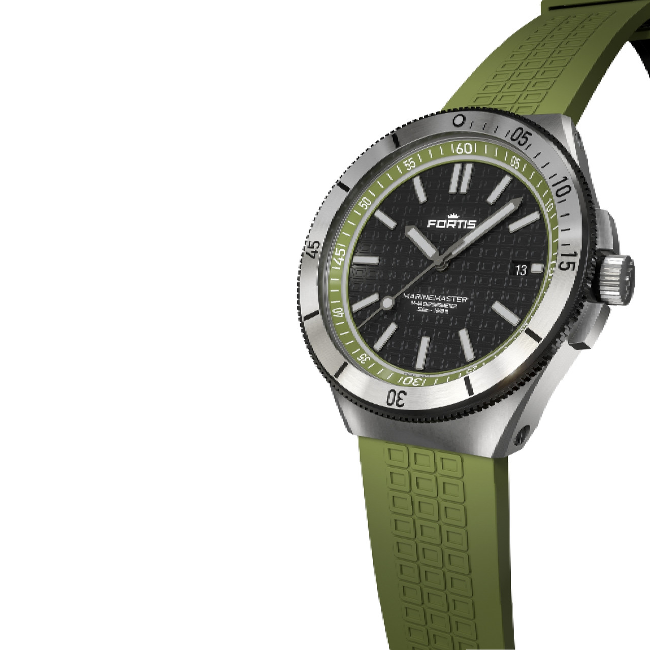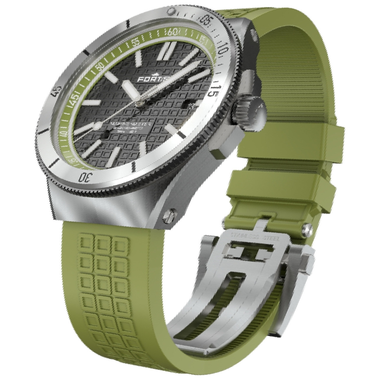 - A woodpecker green rubber strap finished with a folding clasp to ensure security on the wrist.