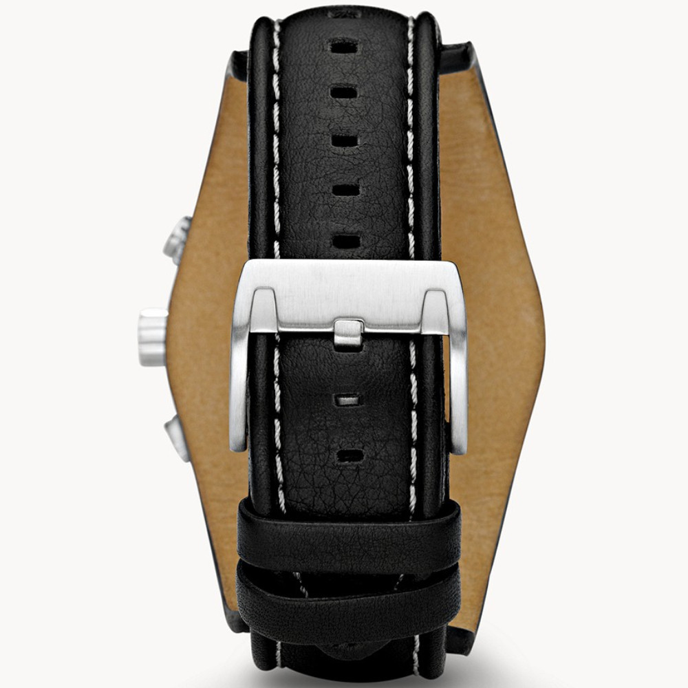 - Black leather strap finished with a buckle clasp to ensure security on the wrist.
