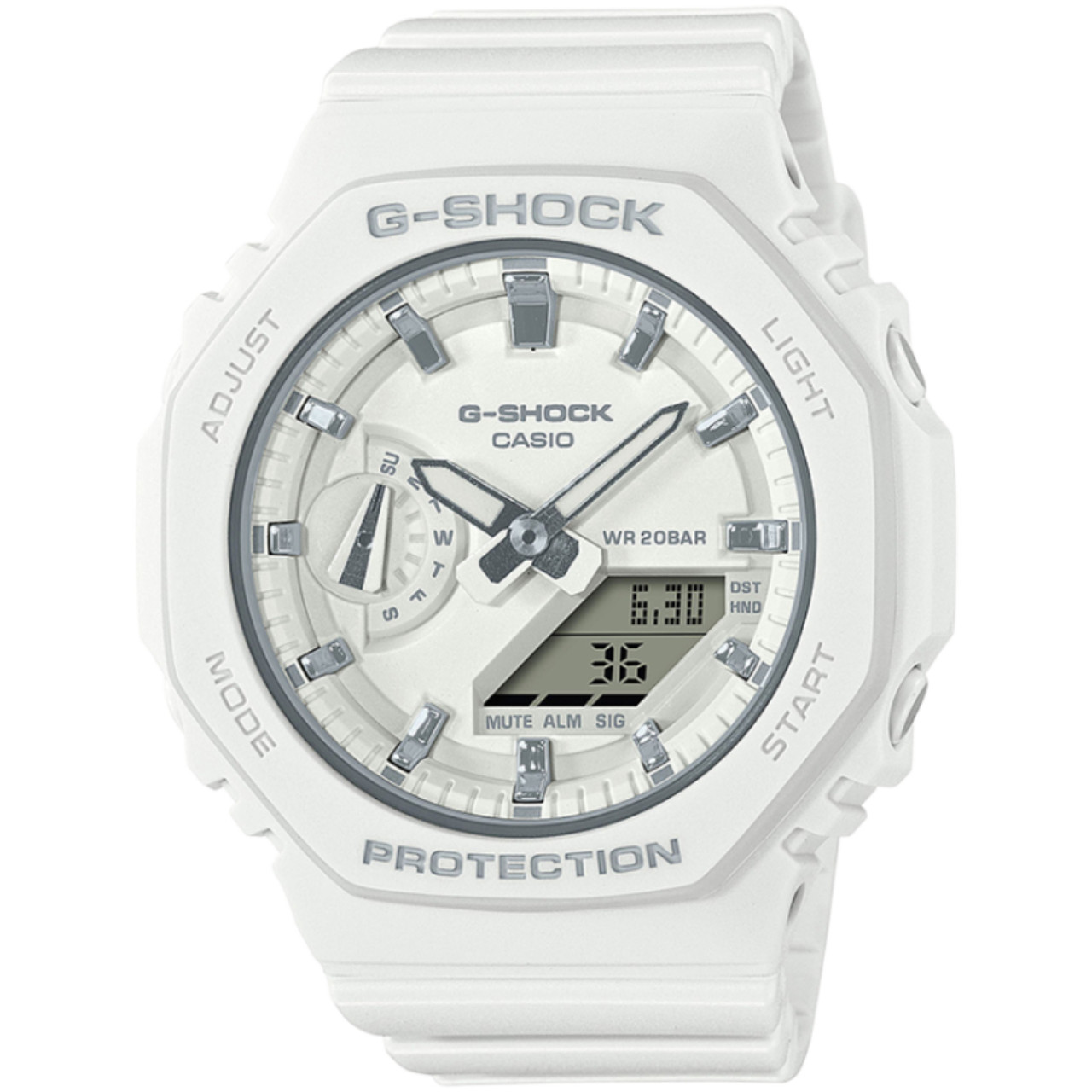 - White resin strap finished with a buckle clasp to ensure security on the wrist.
