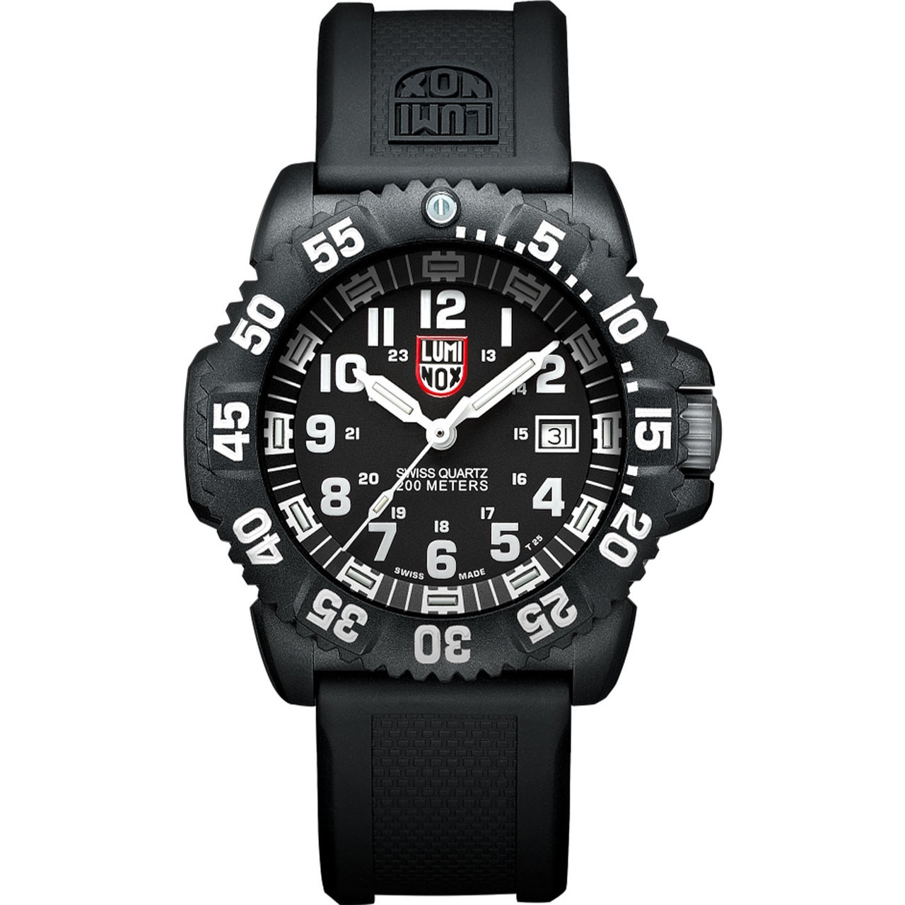 - This watch from the Luminox collection features a black dial with white hands and arabic numeral hour markers and the "Luminox" logo at the 12 o'clock.