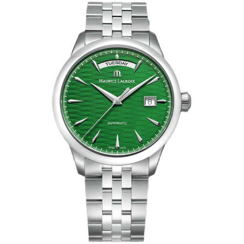 - Maurice Lacroix men's watch with a green dial featuring a jura waves motif and silver powder-printed details.