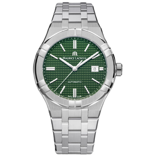 - A green HMSD dial enriched with a Clous de Paris motif, showcasing Maurice Lacroix's signature precision and elegance.