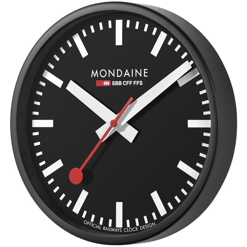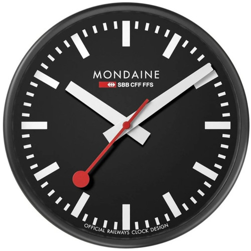 - This wall clock from the Mondaine collection features a black dial with white hour markers and red second hand, and the "Mondaine" logo at 12 o'clock.