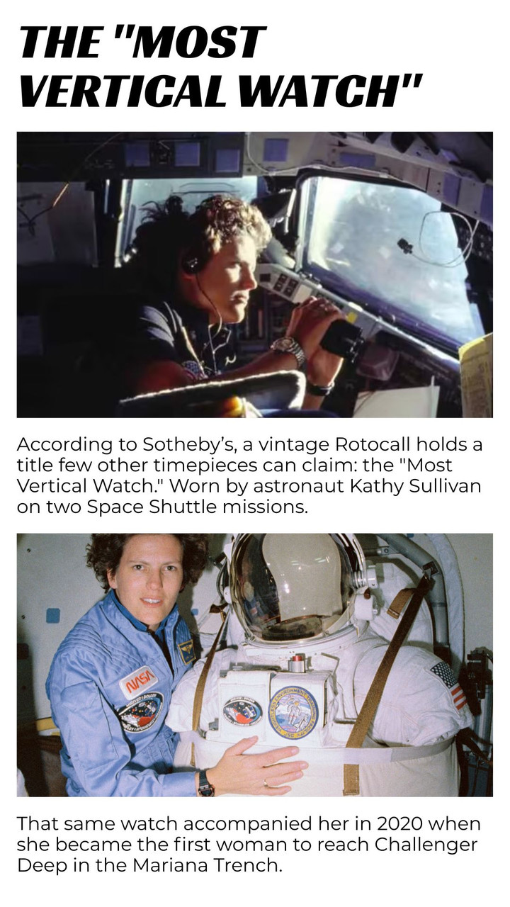 • The Rotocall’s pedigree is unmatched. It is famously known as the “Most Vertical Watch,” a title earned on the wrist of astronaut and oceanographer Kathy Sullivan.