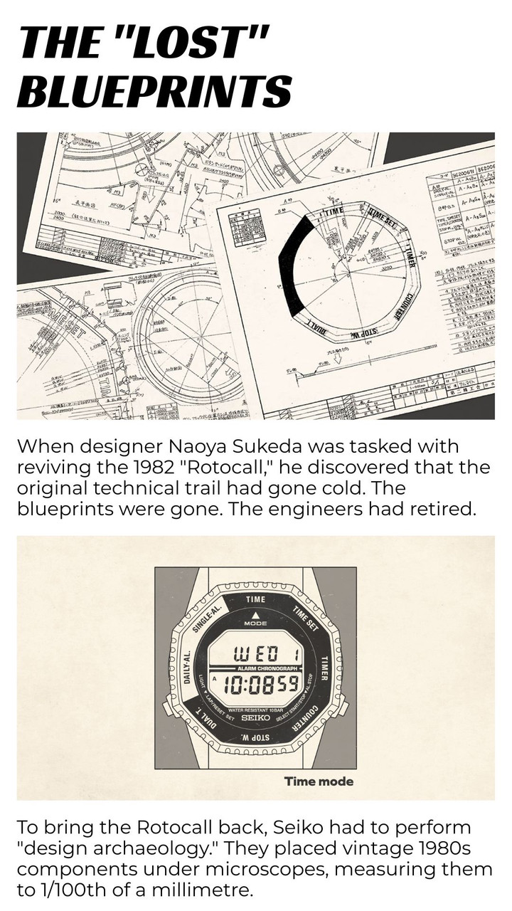 • Reviving the Rotocall for a new generation required a mission of true “design archaeology.” With original blueprints lost, Seiko’s designers at the Seiko Design Center reconstructed the watch using microscopes and 1/100th-of-a-millimetre measurements of vintage museum pieces.