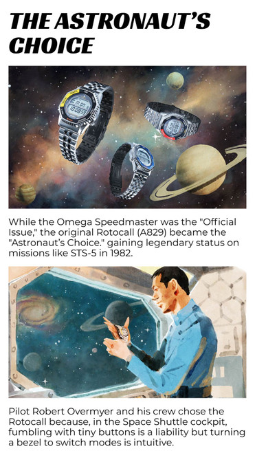 • The Rotocall’s pedigree is unmatched. It is famously known as the “Most Vertical Watch,” a title earned on the wrist of astronaut and oceanographer Kathy Sullivan.