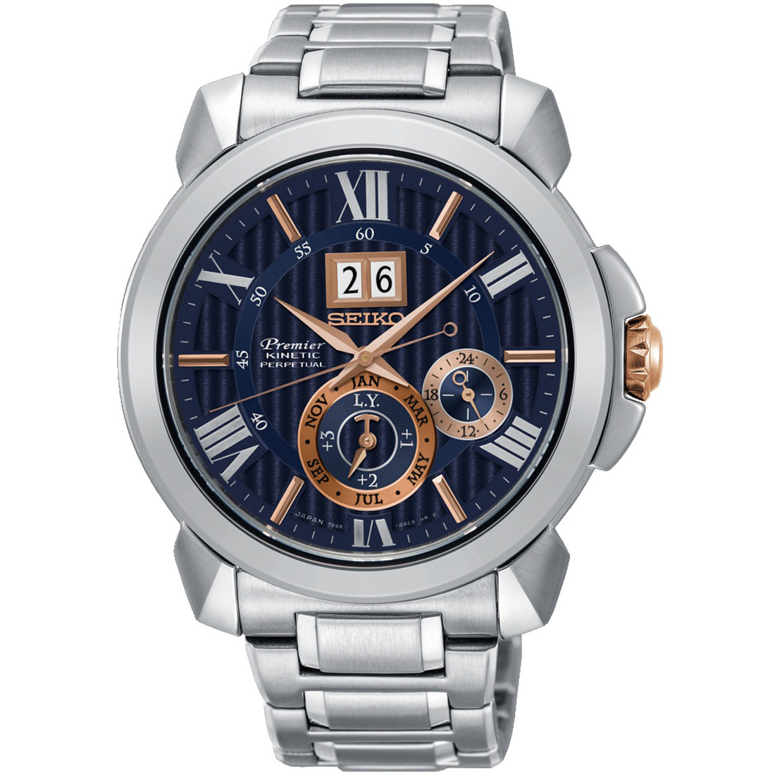 - This striking watch from the Seiko Premier Kinetic collection features a blue dial with roman numerals indexes and hands, and the "Seiko" logo at the 12 o'clock.