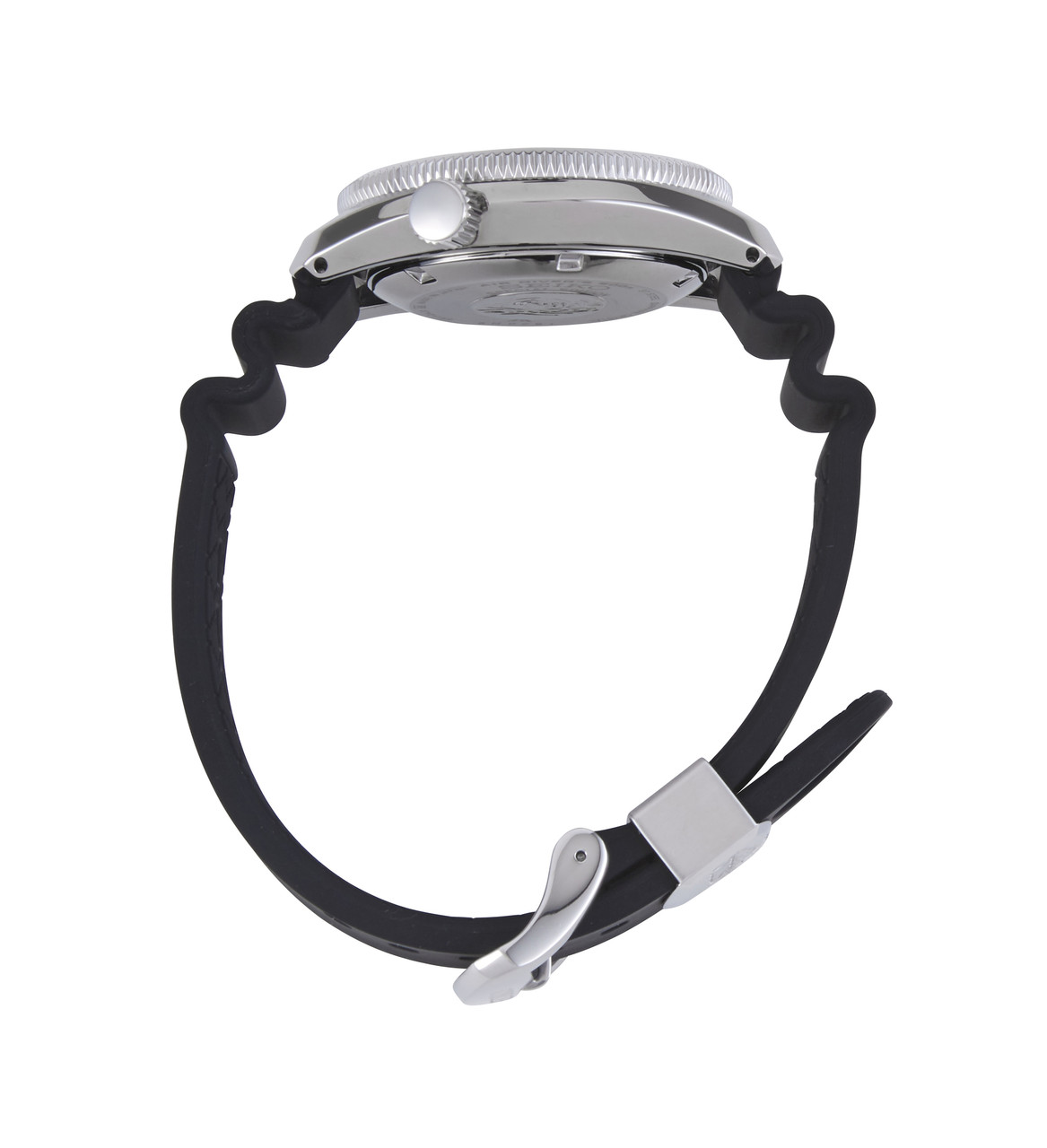 - Black silicone strap watch with buckle clasp.