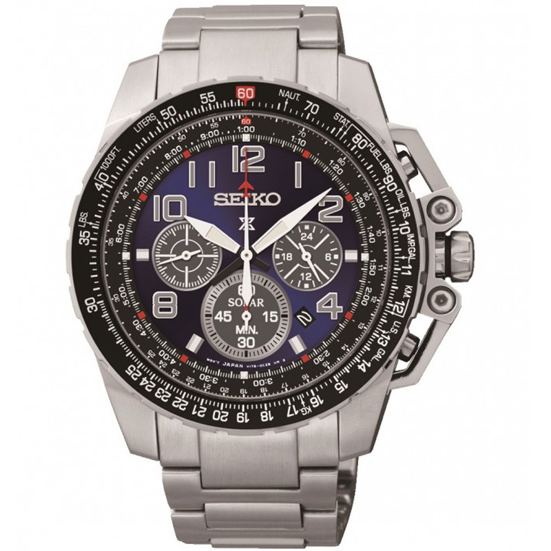 - This watch from the Seiko collection features a blue dial with silver hands, and the "Seiko" logo at the 12 o'clock.
