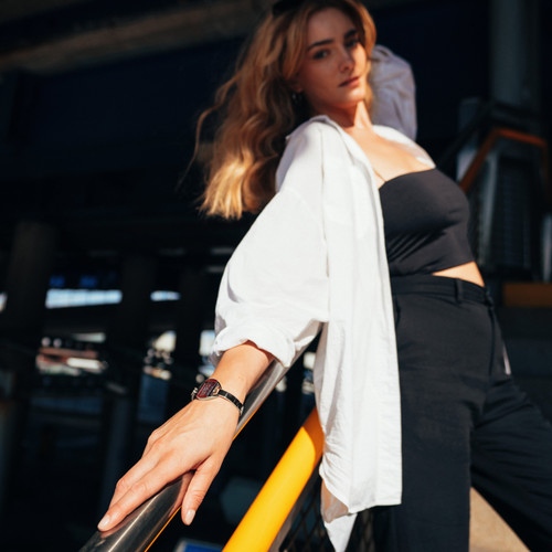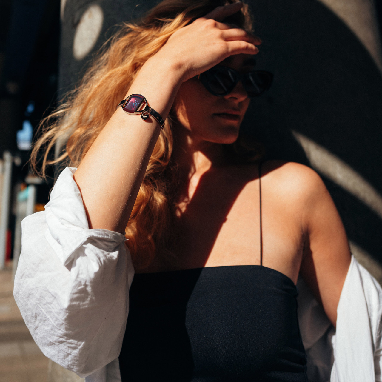 - The watch is curved to fit neatly around your wrist with deep red sunray glass dial and a cute heart charm, accented with a single crystal.