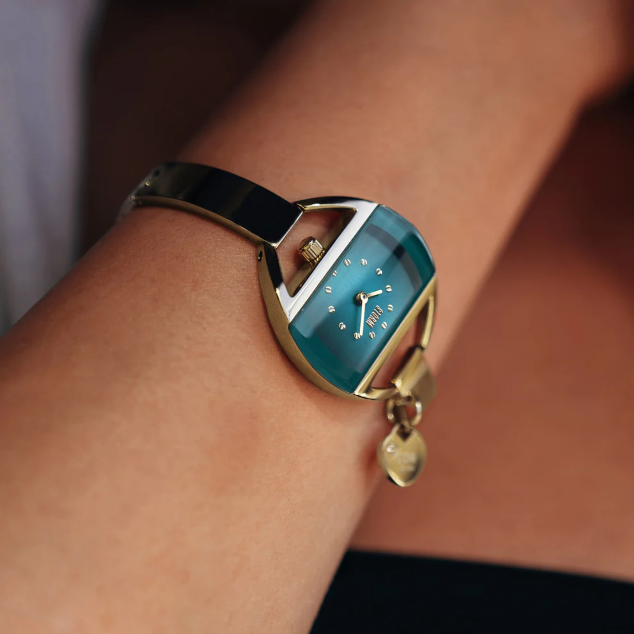 - The watch is curved to fit neatly around your wrist with a teal dial and a cute heart charm, accented with a single crystal.