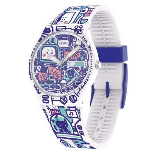 - A solid matte white silicone strap with multi-coloured print having solid matte dark blue silicone loop with print finished with a solid matte dark blue plastic pin buckle clasp to ensure security on the wrist.