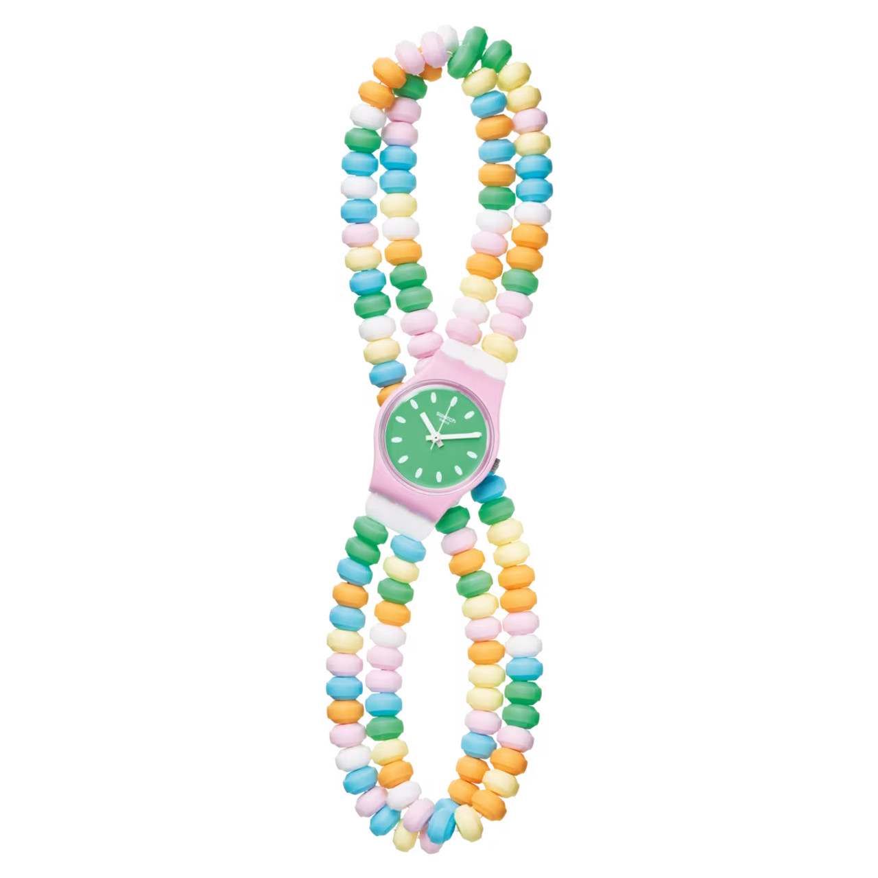 - This watch is finished with a double tour strap adorned with vibrant, candy-coloured links, adding a playful and stylish touch to the design.