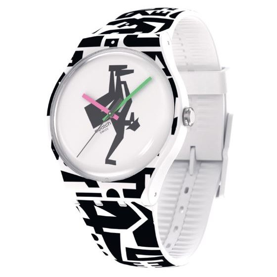 - A white dial with black print Swatch watch.