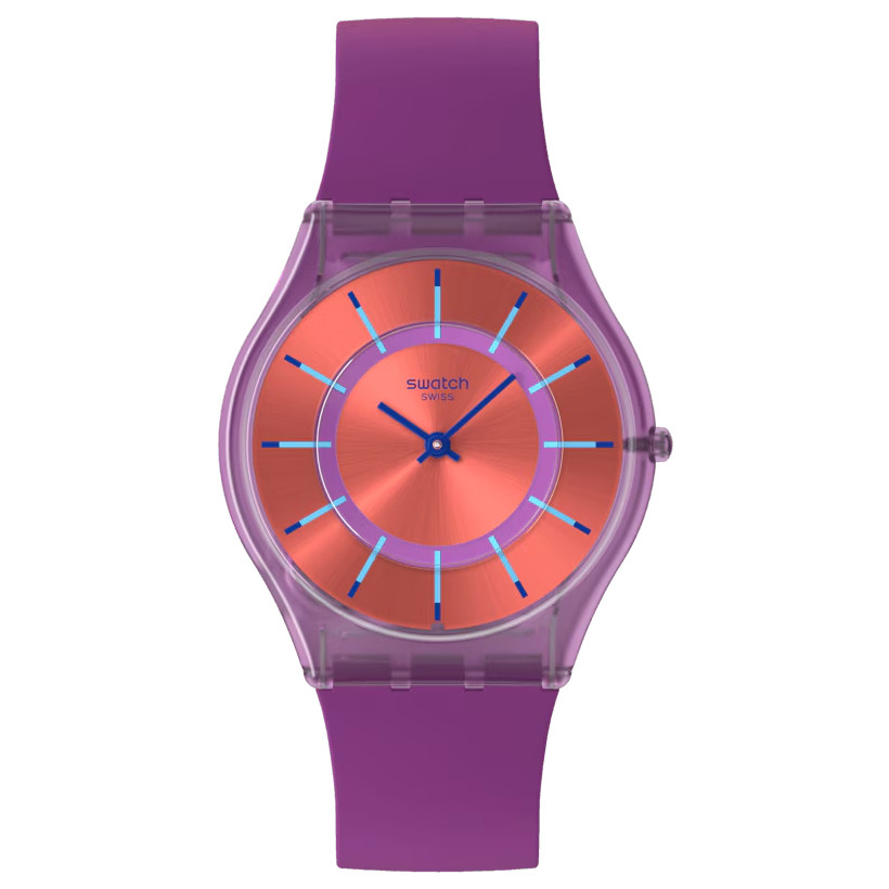 - This ultra-slim watch sports a dark pink sun-brushed dial with a purple printed inner ring, dual-toned light blue and dark blue hour markers and dark blue hour and minute hands all under biosourced glass.