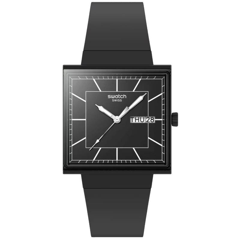- The square, matte black Bioceramic watch case features edge-to-edge biosourced glass that gives a side view of the white printed indexes and minute track.