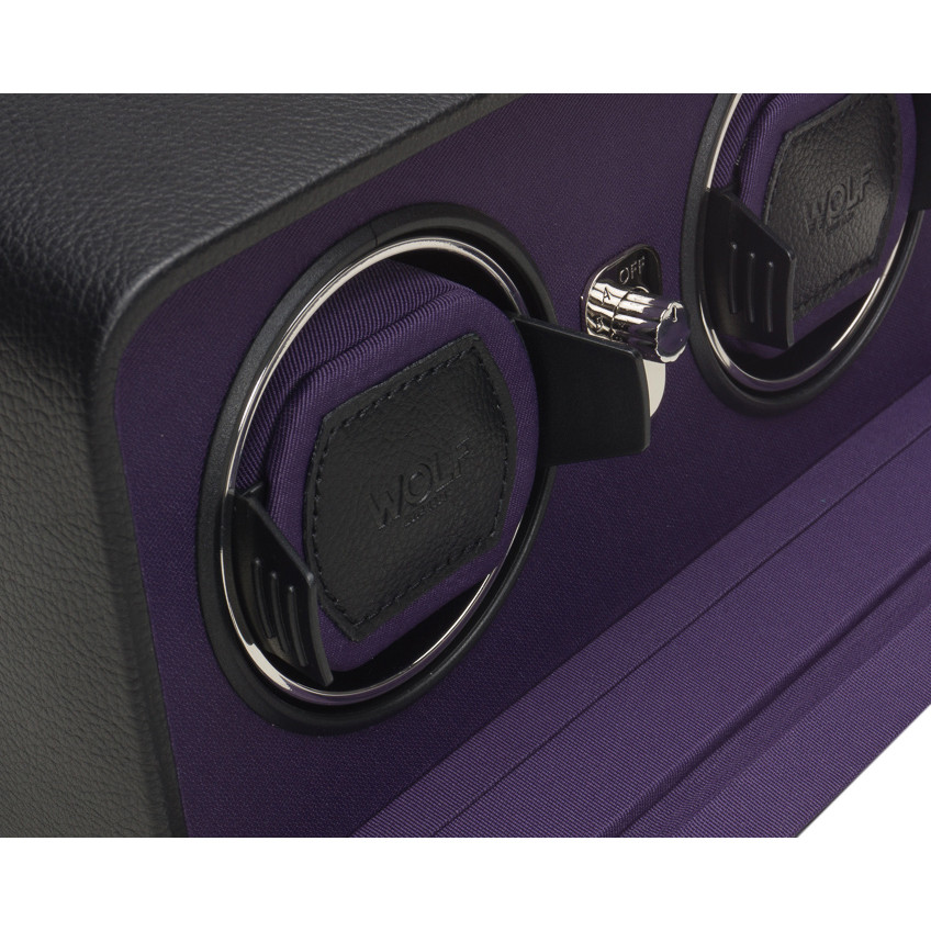 - This watch winder from Windsor collection has chrome finished hardware, glass cover, black pebble leather and purple textured silk faceplate.