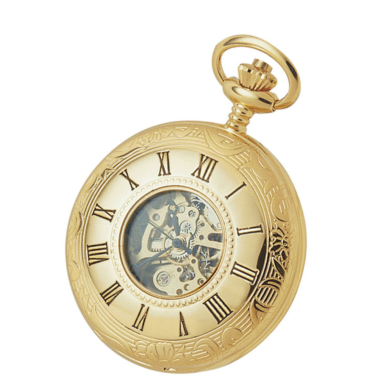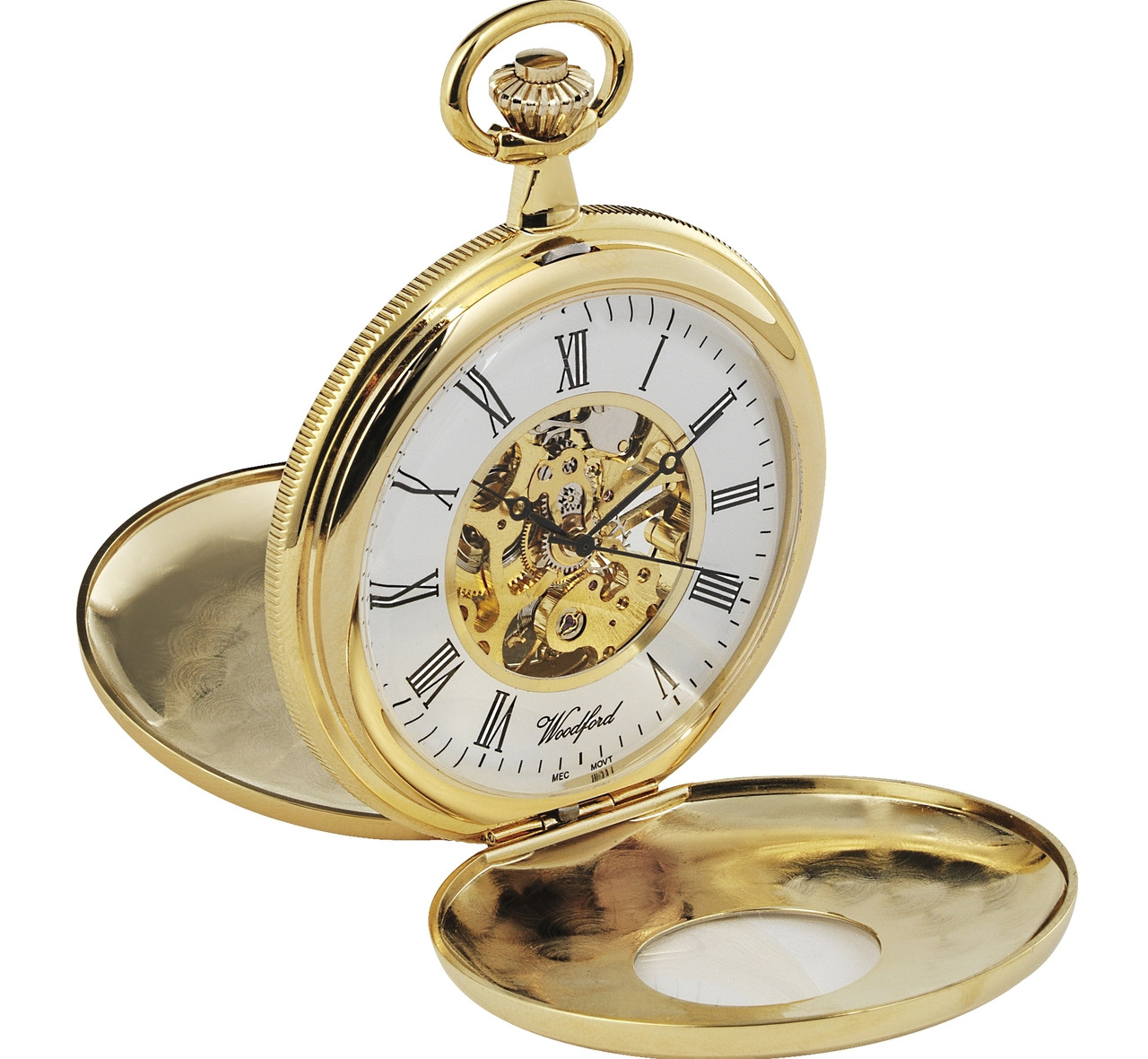 - Woodford 17 jewel mechanical 3 hand double half hunter pocket watch 1078 in gold tone steel case with chain and 1 year warranty.