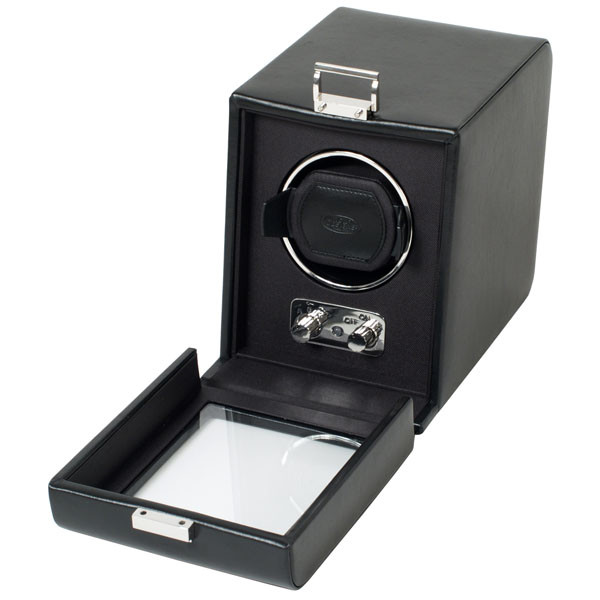 - This watch winder has a black leatherette finish, Glass cover, chrome finished hardware and a single winding module.