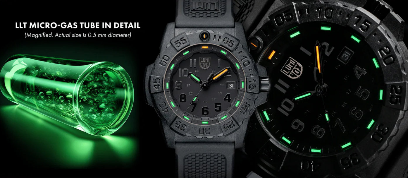 To appreciate Luminox Light Technology (LLT), it helps to compare it with the typical glow on most watches. Traditional watches use phosphorescent paint (like Super-LumiNova) that must be “charged” by an external light source. They shine brightly at first, but after a few hours in the dark that glow fades. Some digital watches have electroluminescent backlights, but you need to press a button to activate them (using up battery power). Luminox flips the script: