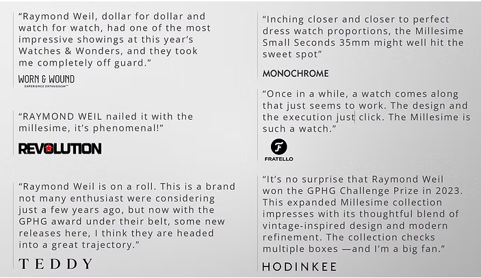 Their Millesime automatic small seconds timepiece was awarded the GPHG 2023 Challenge Prize, celebrating the finest watch — a powerful endorsement of Raymond Weil's mission to deliver exceptional Swiss craftsmanship at an accessible price.