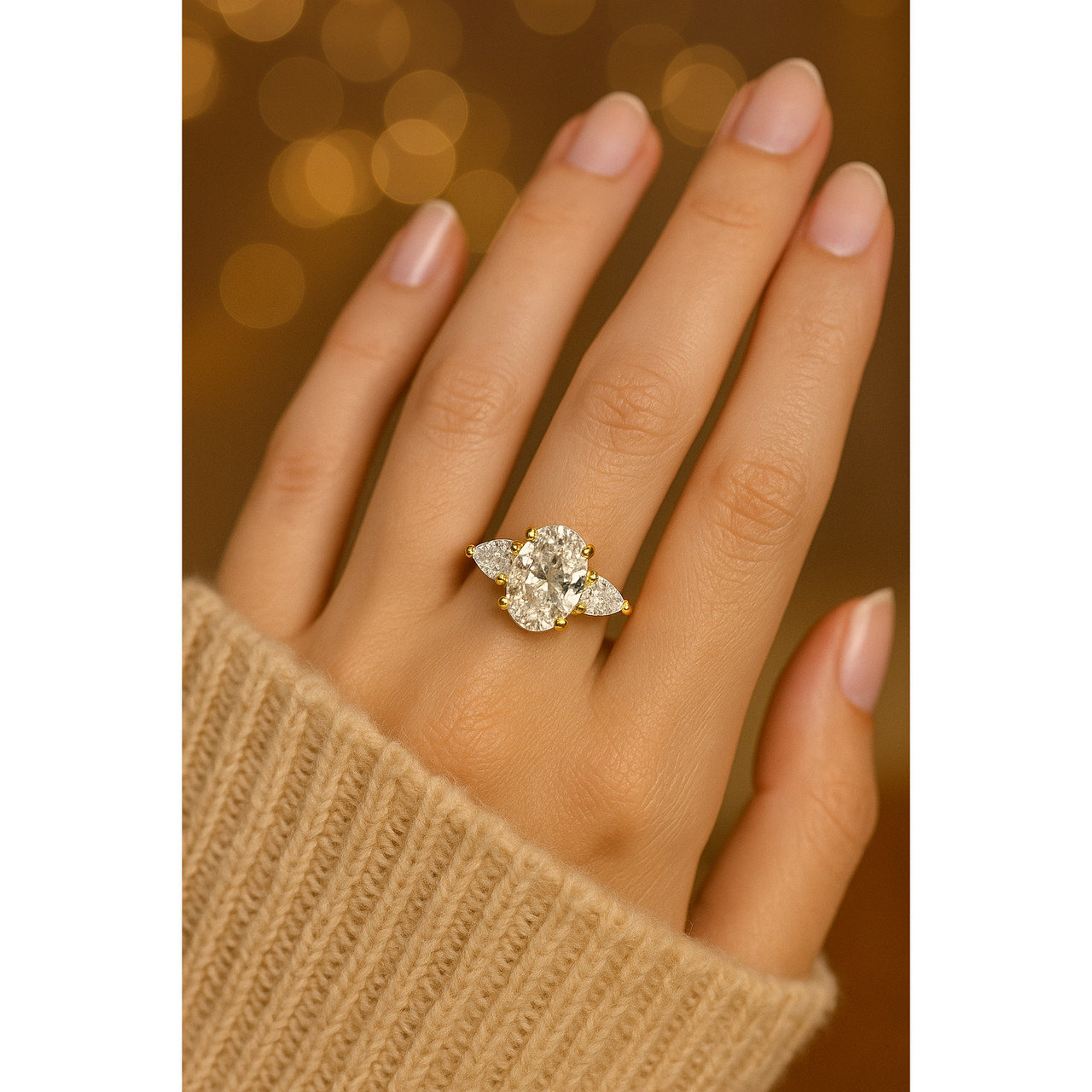 - Elegant 1.53ct oval brilliant cut lab diamond trilogy ring set in timeless 18ct yellow gold for radiant sophistication.