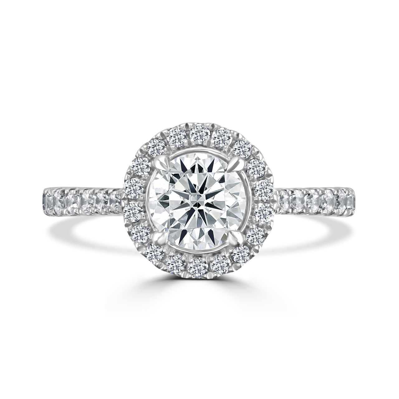 - Stunning Diamond Halo Platinum Ring 1ct Diamond 1.38 Carat Total Round Brilliant Cut Claw Set Shoulders.